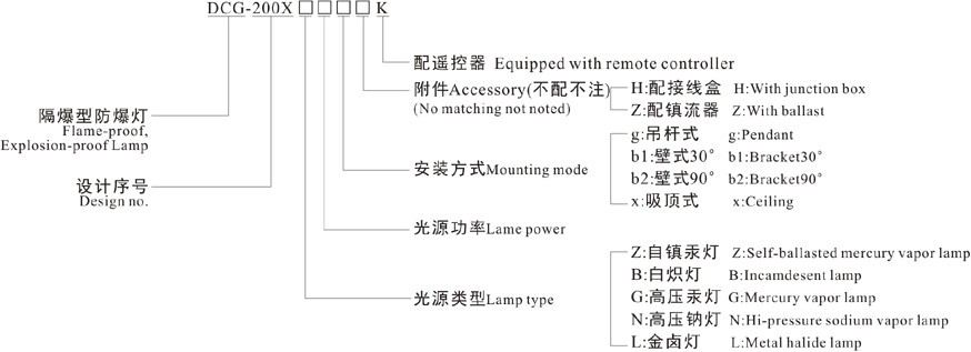 1、Select item by item according to description of product model, if a pendant type product with halide lamp of 70W and junction box, its model shall be DCG200-L100gH.