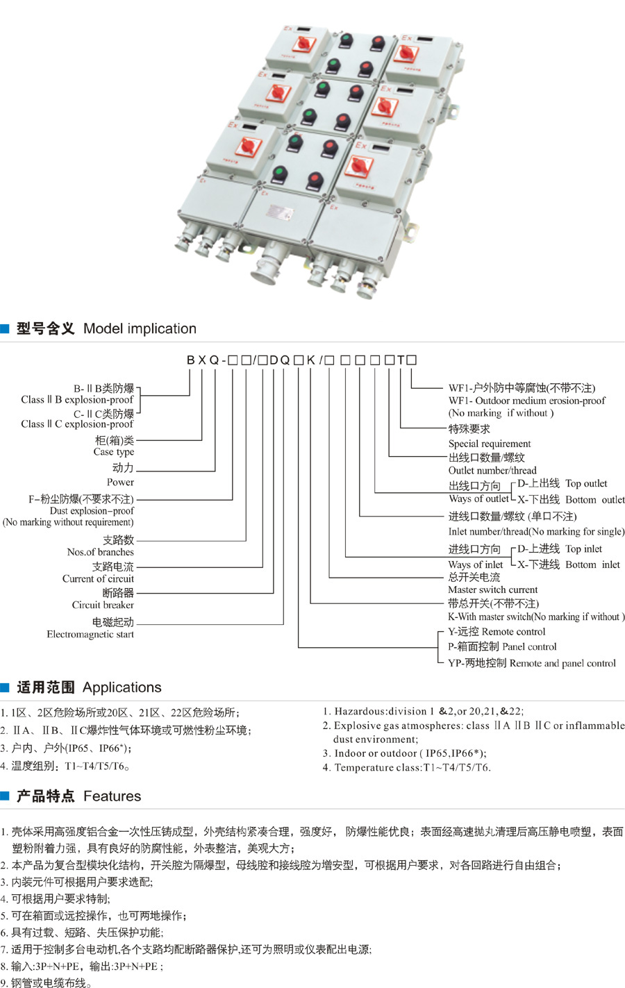 1、壓鑄鋁合金或鋼板焊接外殼,表面噴塑。 2、適用于控制多臺(tái)電動(dòng)機(jī),還可為照明或儀表配出電源。 3、內(nèi)裝元件可根據(jù)用戶要求選配。 4、可在箱面或遠(yuǎn)控操作,也可兩地操作。 5、具有過載、短路、失壓保護(hù)。 6、鋼管或電纜布線均可。">