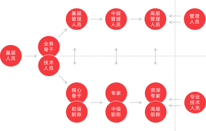 為所有員工提供管理與專業(yè)技術(shù)雙重職業(yè)發(fā)展通道(員工可以通過(guò)管理崗位或?qū)I(yè)技術(shù)通道獲得高報(bào)酬)。通過(guò)任職資格標(biāo)準(zhǔn)牽引、資格認(rèn)證推動(dòng)以及培訓(xùn)平臺(tái)支持,不斷幫助員工提升任職能力,使員工逐步勝任更高級(jí)別職位,從而實(shí)現(xiàn)員工職業(yè)發(fā)展的理想。